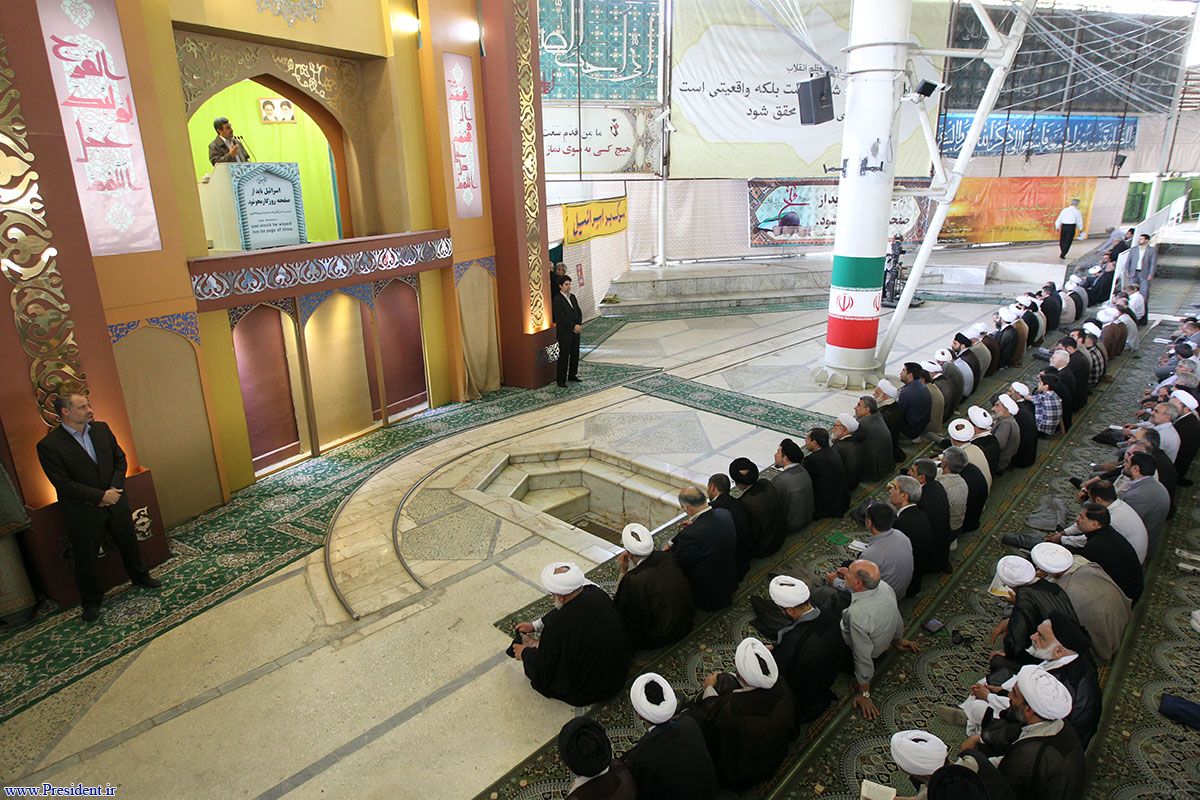 ما مديران ستادي شوراي سياستگذاري ائمه جمعه سراسر کشور که 8 سال است شاهد تلاش پر حجم، خستگي ناپذير و بي وقفه دولت نهم و دهم بوده ايم به مصداق من لم يشکر المخلوق لم يشکر الخالق از همکاري مؤمنانه و مساعدت هاي مؤثر شما با اين شورا و امامان جمعه سراسر کشور در امر عمران و رونق مصلاهاي شهرها صميمانه تشکر و قدرداني مي کنيم و بر اين باوريم که اگر هيچ يک از مساعي شبانه روزي شما و همکاران عزيزتان همچون پرهيز از تجملات و خوي اشرافي، الفت با محرومان، بي اعتنايي به امتيازات، تهيه مسکن مهر براي خانه بدوشان، هدفمندي يارانه ها، کشف مديران مومن و مخلص، سفرهاي استاني و امثال آن نبود، تنها شجاعت برجسته کردن شعارهاي انقلاب در داخل و خارج و فرياد رساي آزادي و عدالت خواهي علني شما از بلنداي بام سازمان ملل کافي است که نامتان در سينه تاريخ به نيکي ماندگار و در خاطره ها مانا شود.